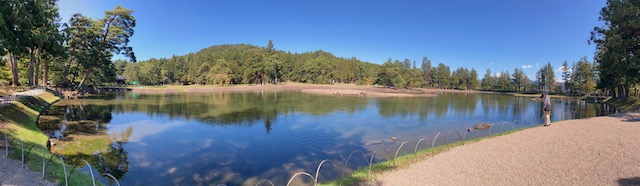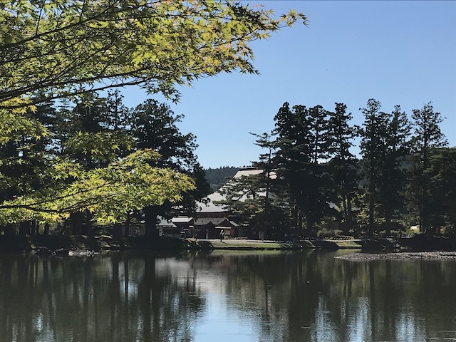 池を中心とし、流れや砂洲を表した見事な日本庭園と、数々のお堂やお堂跡です。