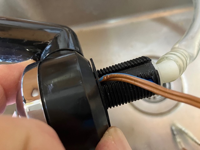 フォーセットを取り外して配線をみてみると、電線の被覆が損傷しています。
